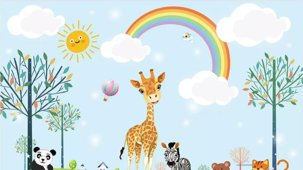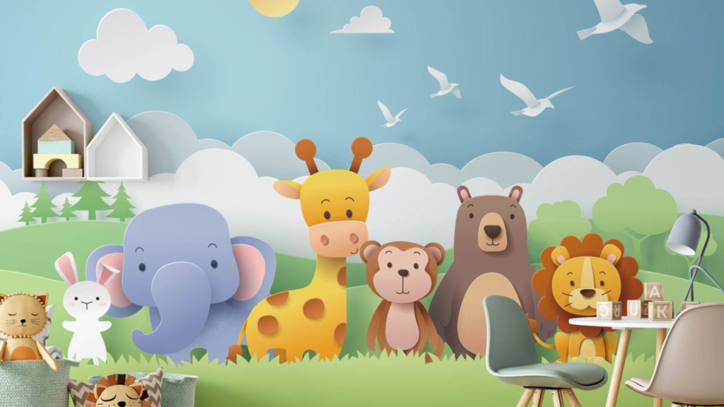 Play school wall painting is designed to create a joyful and friendly environment for very young children. Walls are filled with colorful cartoons, animals, flowers, and playful patterns. Smiling suns, rainbows, and cute characters make children feel safe and happy.